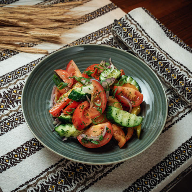Okroschka, Schaschlik oder Kartoffelpuffer und eingelegtes Gemüse – alles frisch und liebevoll zubereitet. Deftiger Genuss in jeder Gabel! Smachnoho!